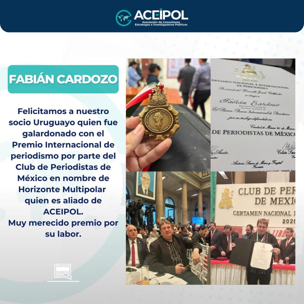 En ACEIPOL expresamos nuestro más sincero reconocimiento a nuestro asociado Fabián Cardozo, quien han sido galardonado por el Club de Periodistas de México en nombre de Horizonte Multipolar, aliado ACEIPOL.